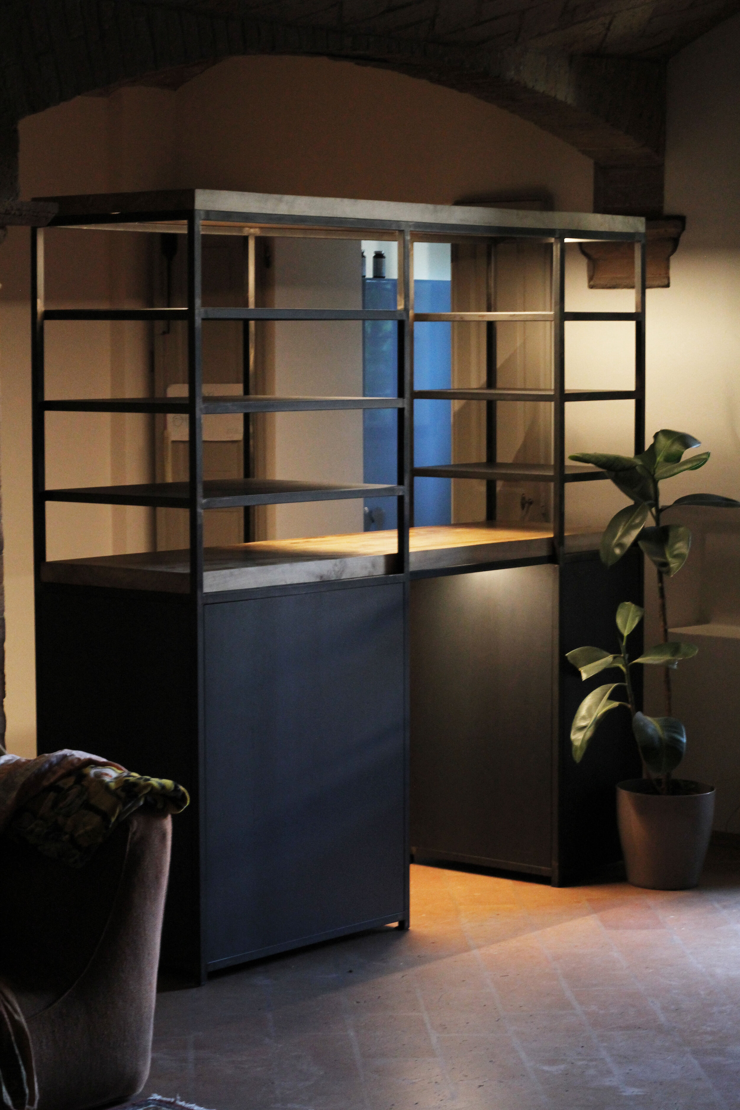Madia in pioppo massello e ferro nero, luce led integrata.