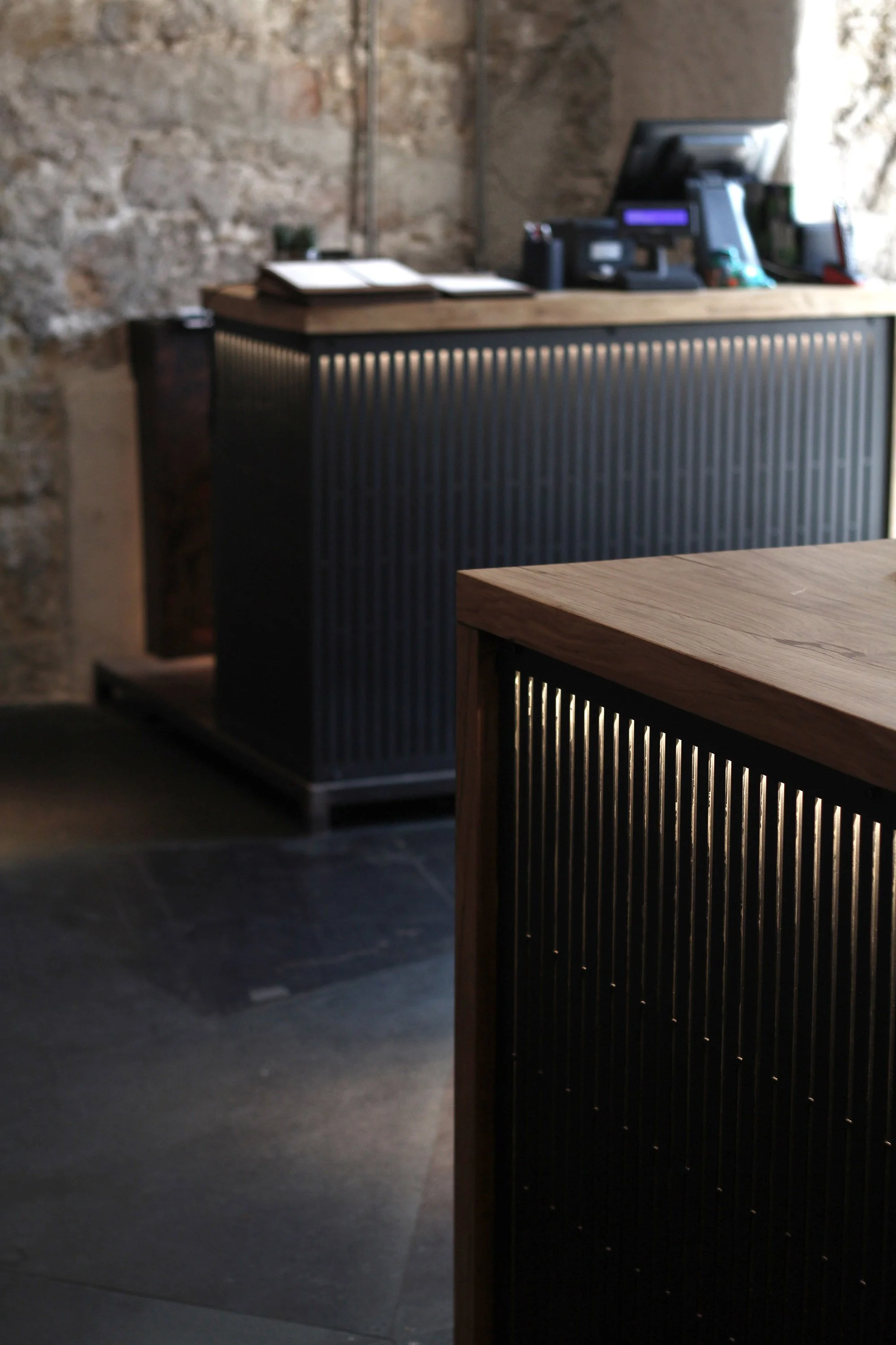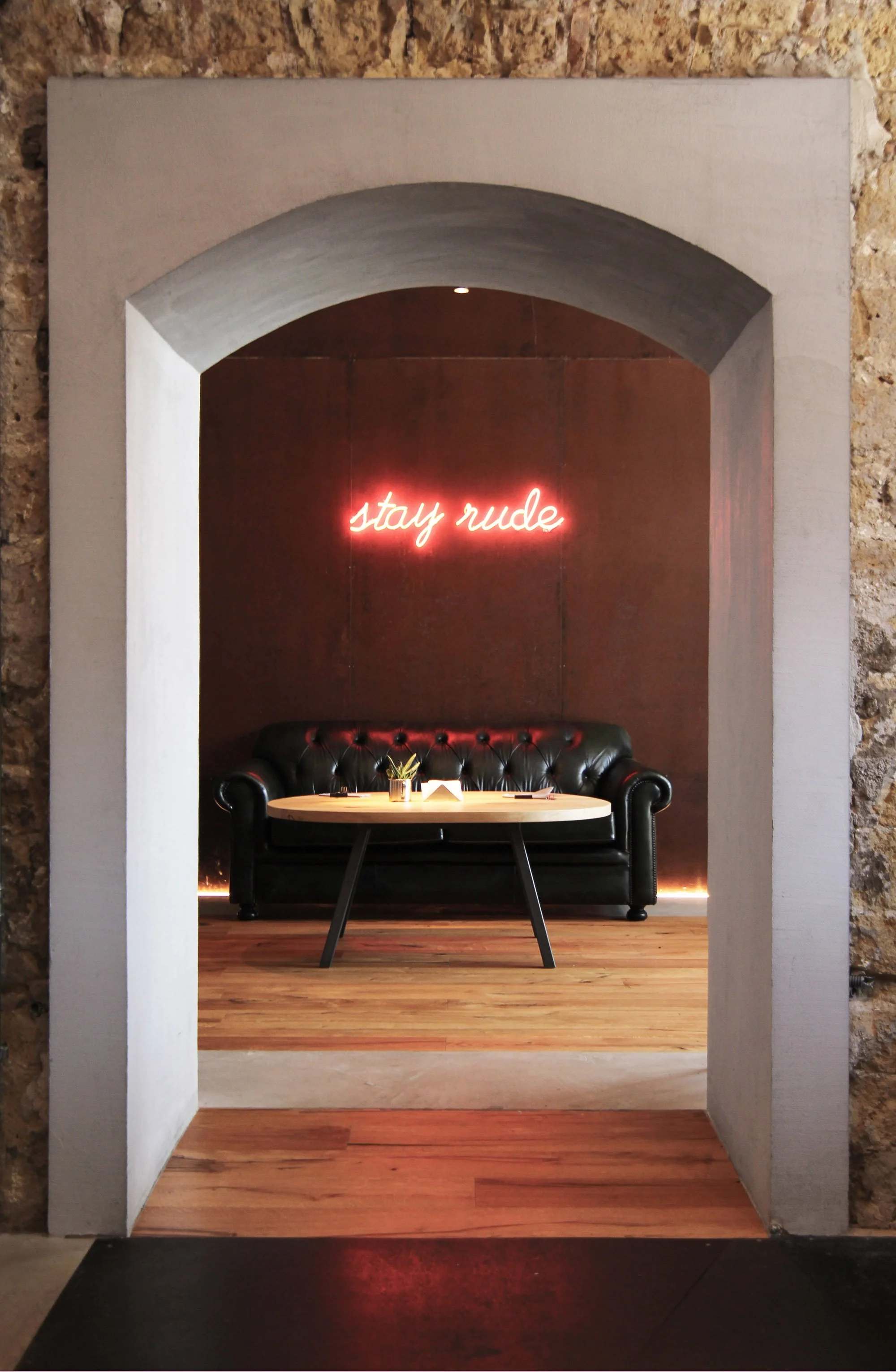 Rielaborare il concetto estetico dello stile industriale applicato a una realtà di giovani talentuosi del luogo con un’ attività già radicata nella vicina Gaeta. “Rude” vuole essere forte, con un’eleganza nel modo di lavorare e una fermezza nell’esprimersi. Così la forza del Cemento, della Quercia e del Ferro si incanala nella minimalismo del taglio delle forme dove ogni materiale si rincorre in un percorso direzionato dalla prospettiva.